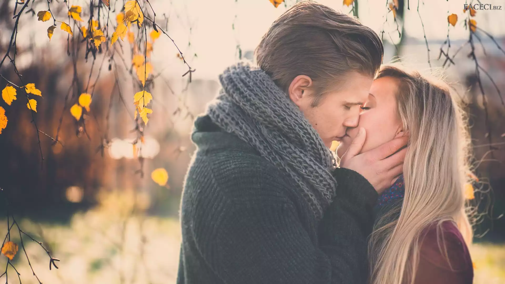 Liście, Mężczyzna, Para, Gałązki, Brzoza, Kobieta, Pocałunek - faceci.biz